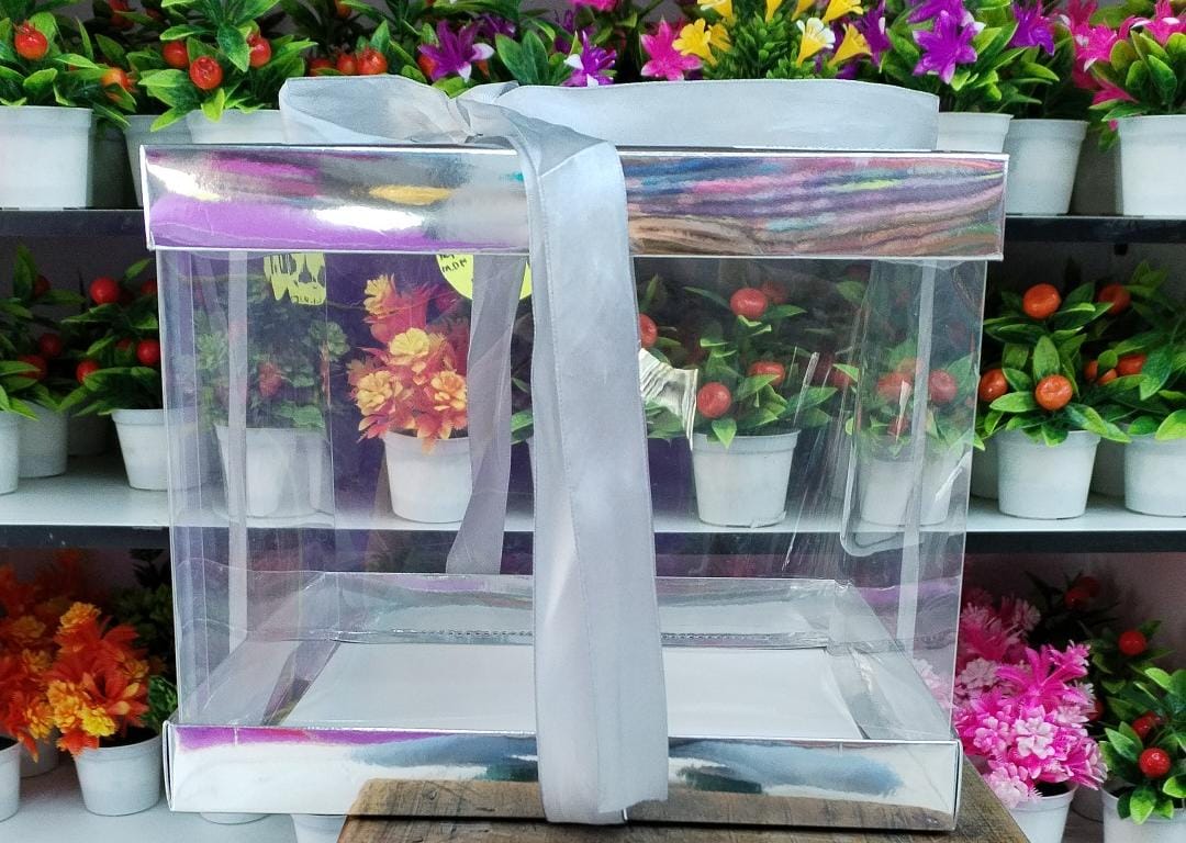 Es una caja transparente de acetato con base y tapa plateadas, diseñada para la presentación elegante de regalos, pasteles o arreglos florales. Estas cajas son populares para ocasiones especiales como bodas, aniversarios o baby showers, ya que permiten exhibir el contenido de forma atractiva.
