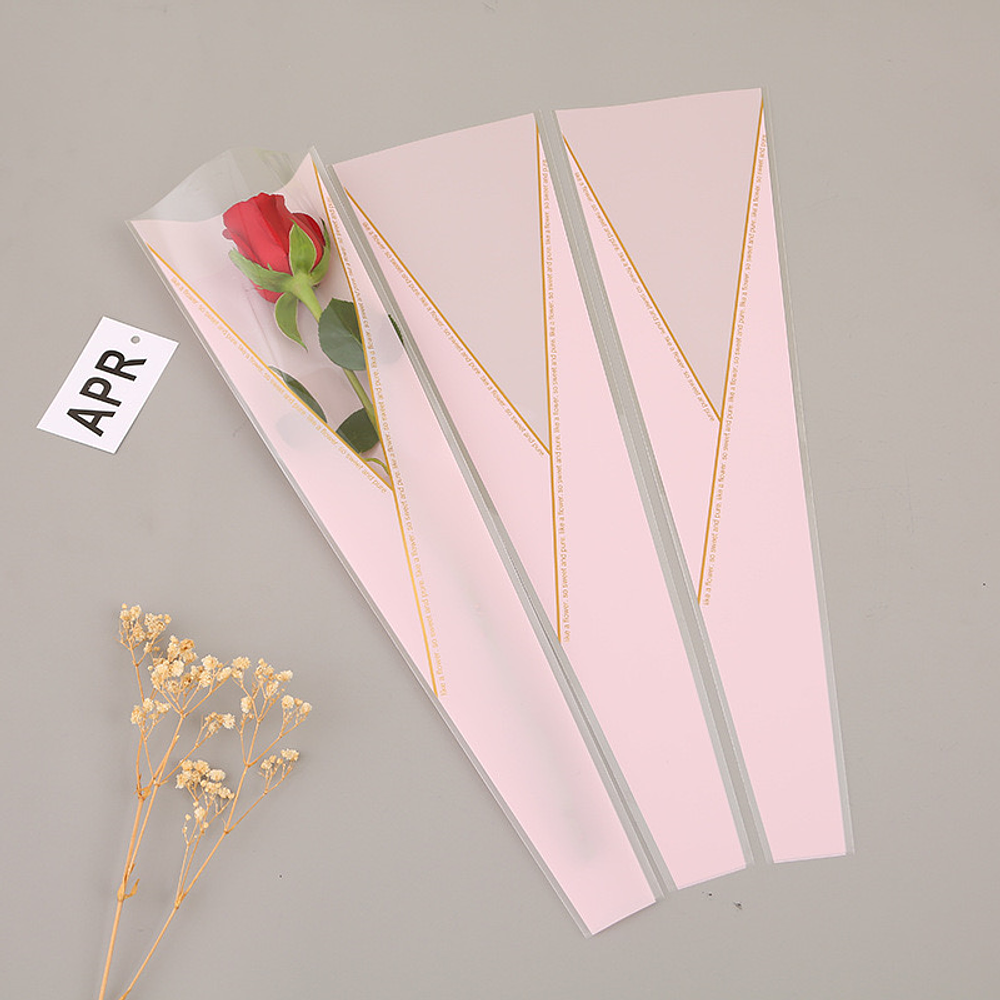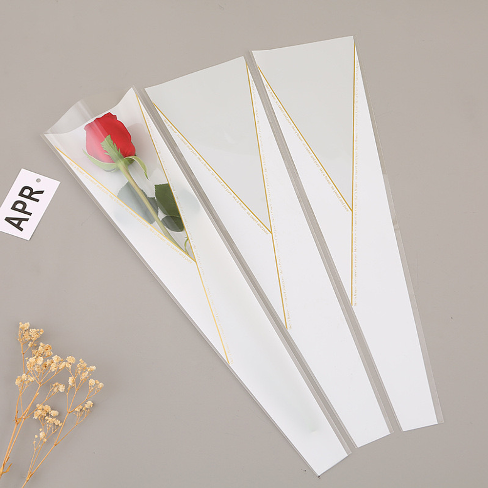 Estas son bolsas para rosas individuales o capuchones para flores, comúnmente hechas de celofán o polipropileno (OPP).