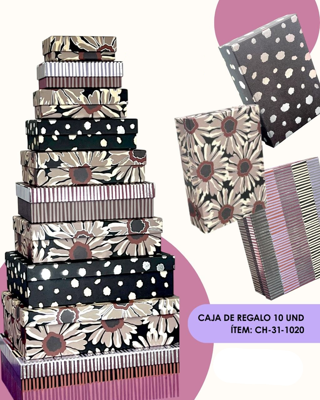 Eleva la presentación de tus detalles con este práctico y elegante set de 10 cajas apilables. Diseñadas en tamaños progresivos, son la solución perfecta para organizar o regalar con estilo.